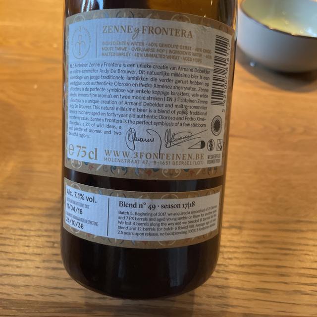 3 Fonteinen Zenne y Frontera is a unique creation of Armand Debelder and maître-sommelier Andy De Brouwer. This natural millésime beer is a blend of young traditional lambics that have aged on forty-year old authentic Oloroso and Pedro Ximénez sherry casks. Zenne y Frontera is the perfect symbiosis of a few stubborn characters, a lot of wild ideas, a vast palette of aromas and two beautiful regions.