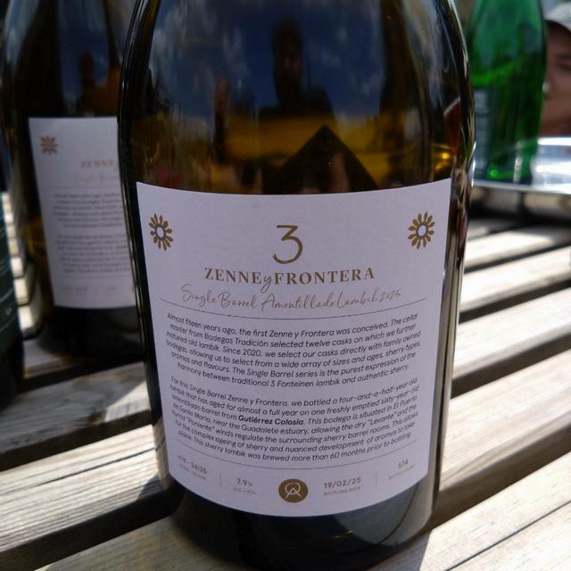 master from Bodegas Tradición selected twelve casks on which we further matured old lambik. Since 2020, we select our casks directly with family owned bodegas, allowing us to select from a wide array of sizes and ages, sherry types, aromas and flavours. The Single Barrel series is the purest expression of the harmony between traditional 3 Fonteinen lambik and authentic sherry. For this Single Barrel Zenne y Frontera, we bottled a four-and-a-half-year old lambik that has aged for almost a full year on one freshly emptied sixty-year-old